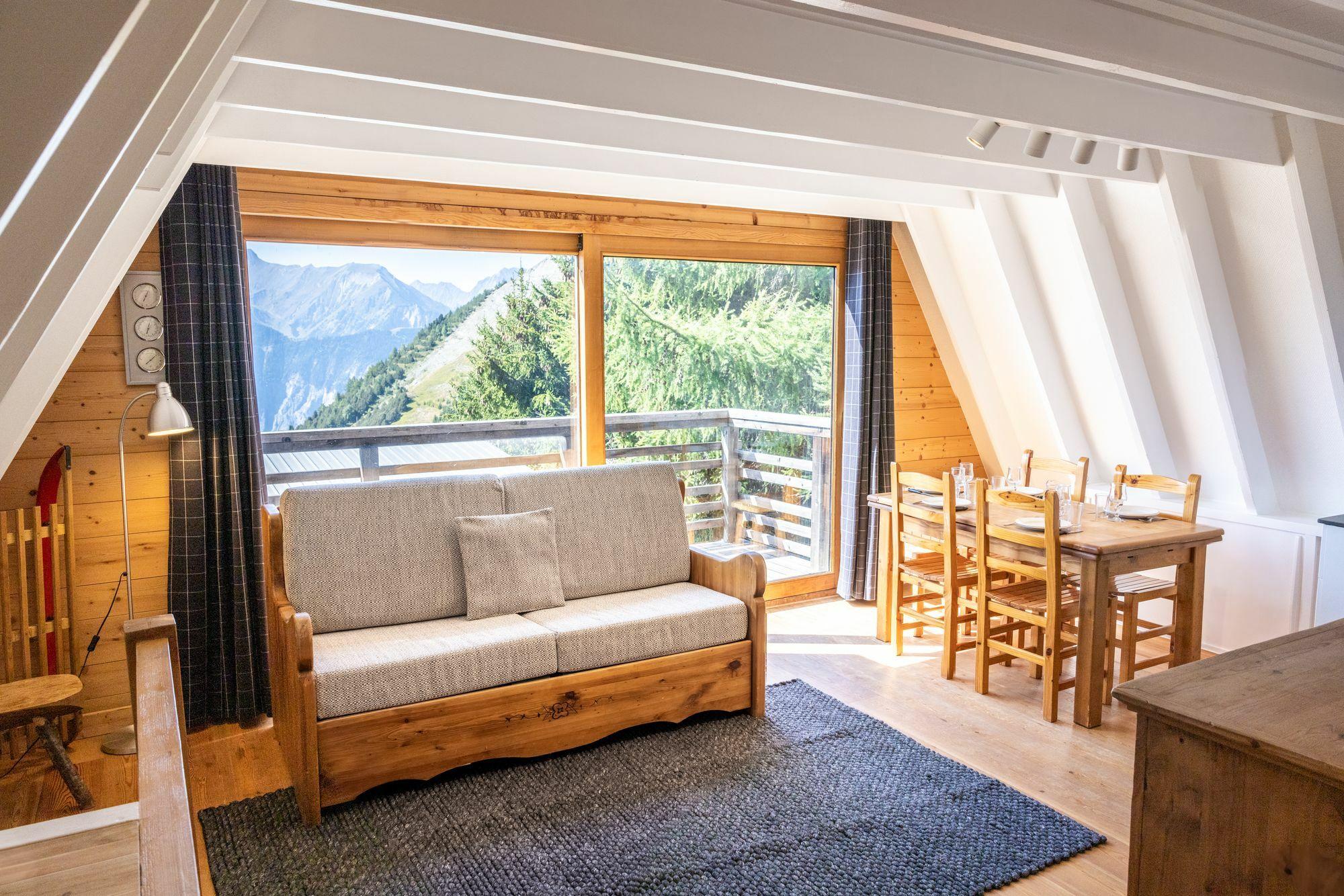 In the heart of a quiet area, this delta chalet will surprise you by its originality. The living room is very pleasant with a breathtaking view of the surrounding mountains and its south-facing terrace. The two bedrooms on the ground floor can accommodate 4 adults, while the two bedrooms upstairs will give the feeling of being in a hut.