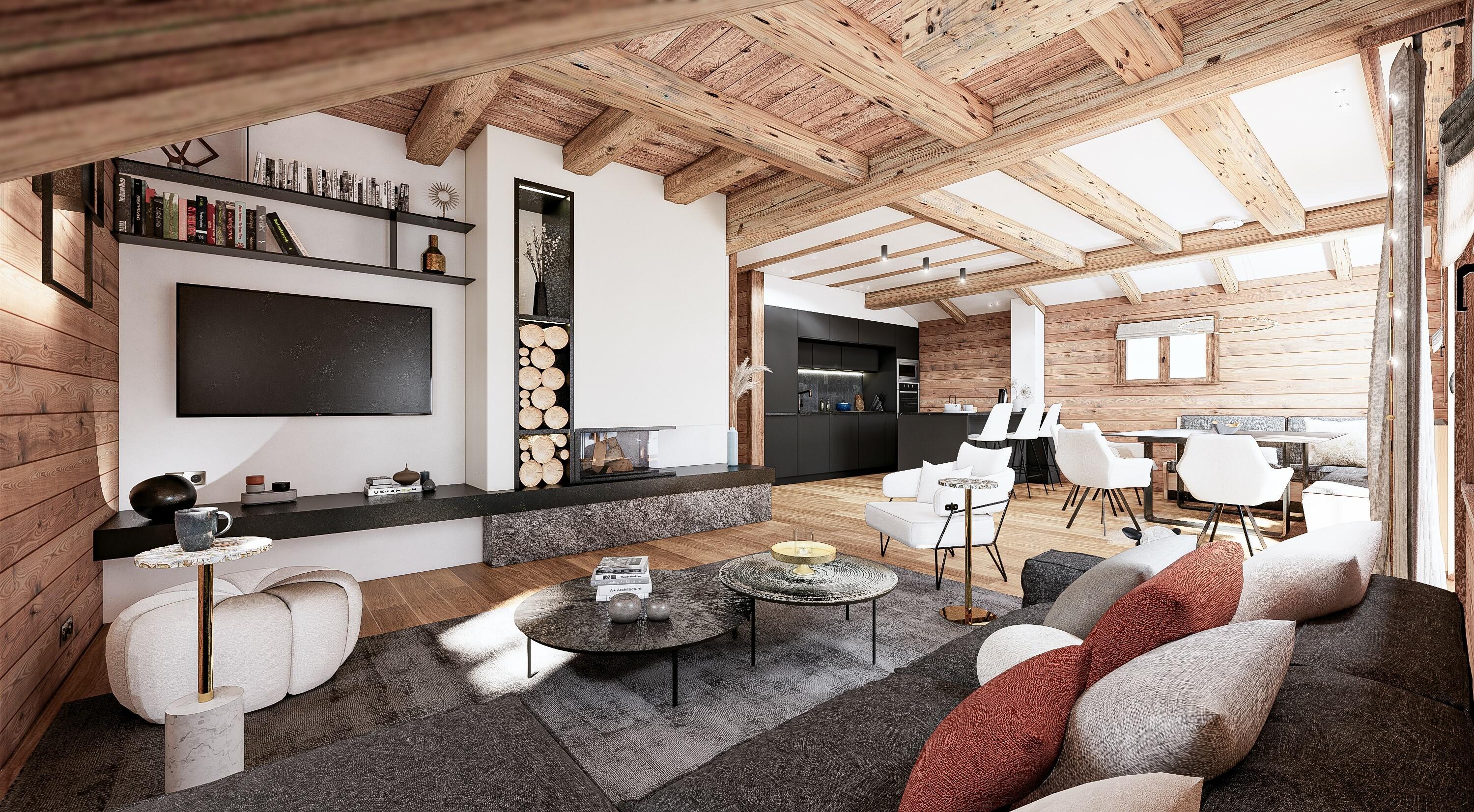 Luminous chalet located by the slopes in Courchevel 1850. Completely refurbished in a style that combines elegance and mountain references, it offers a wooded environment with panoramic views of the mountain.