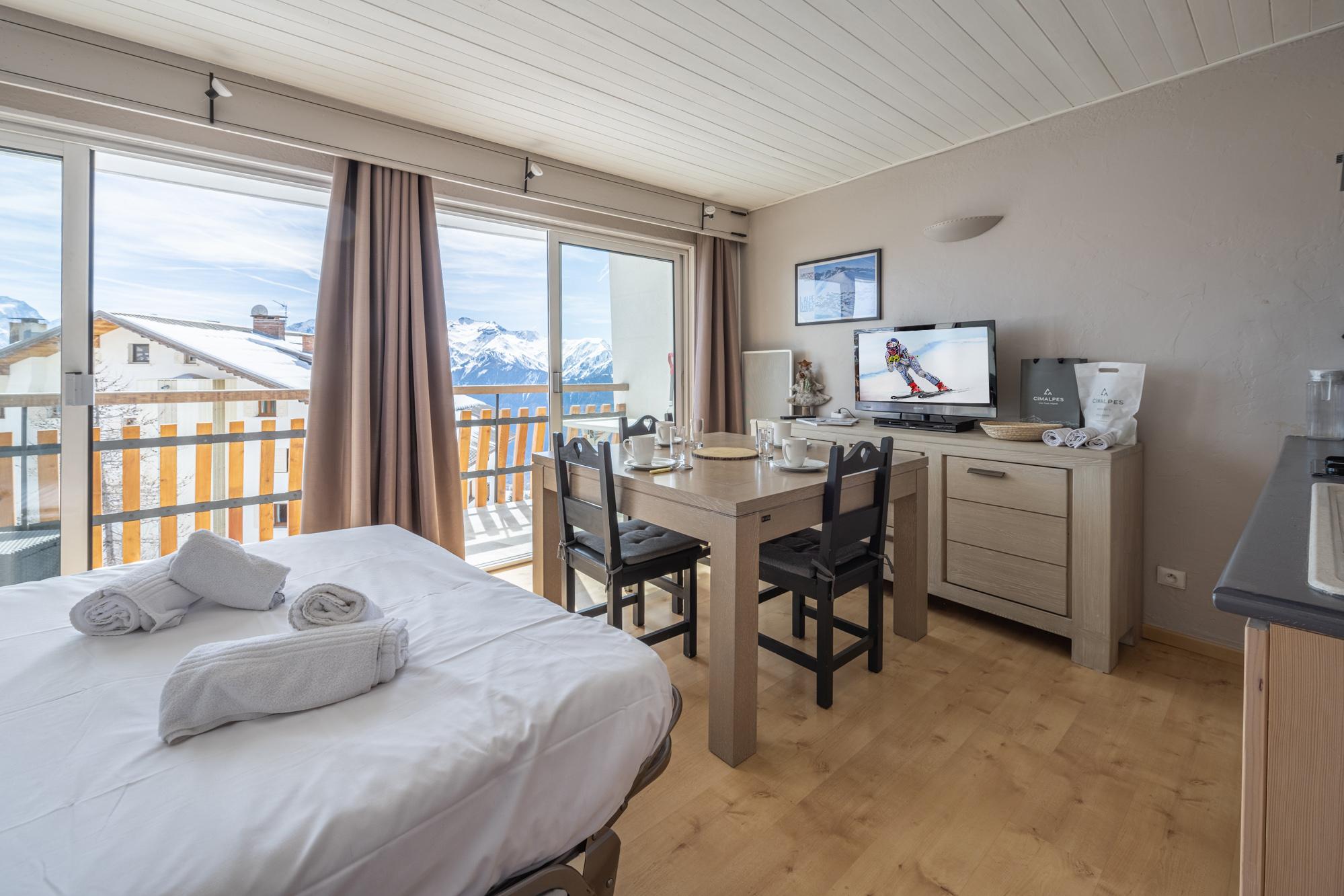 Nice studio facing South with a large balcony and large bay windows allowing the sun to bring light to the living spaces. It offers ski in ski out from the residence which is located din the heart of Courchevel Moriond.