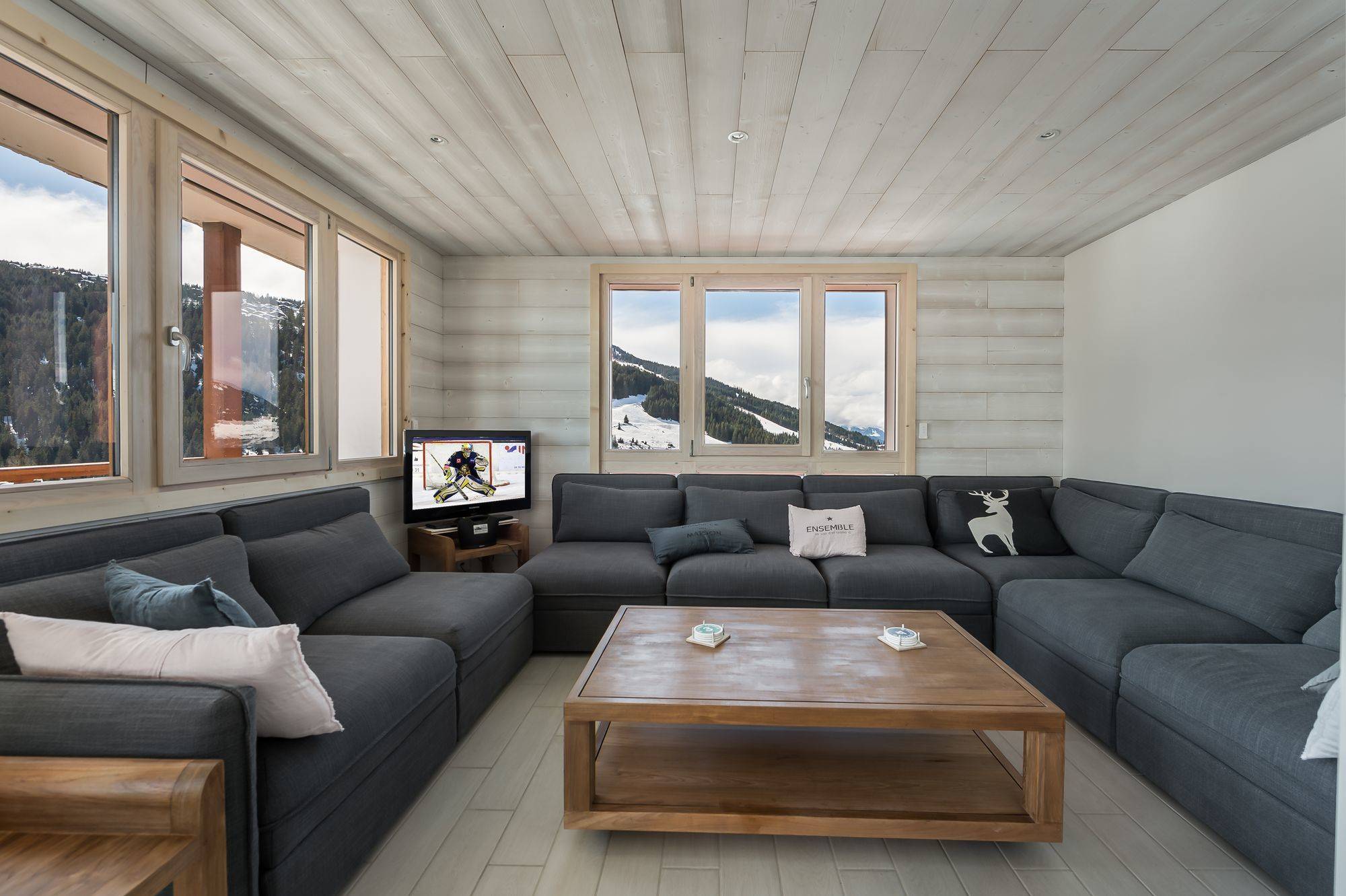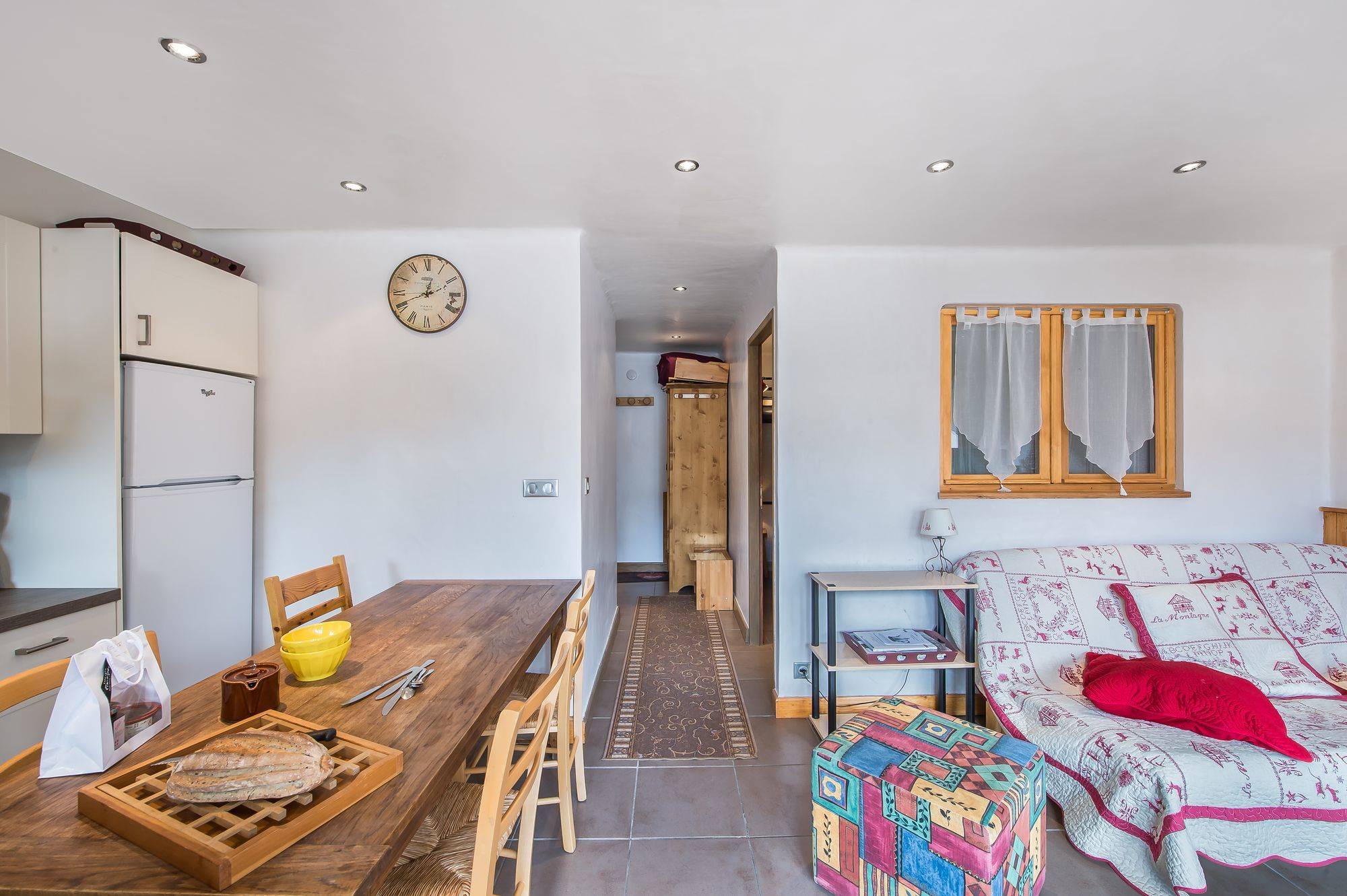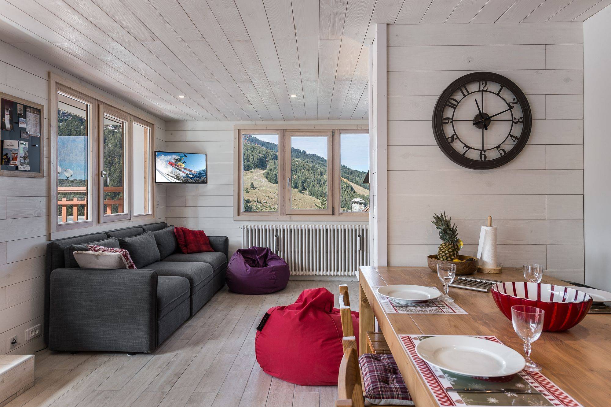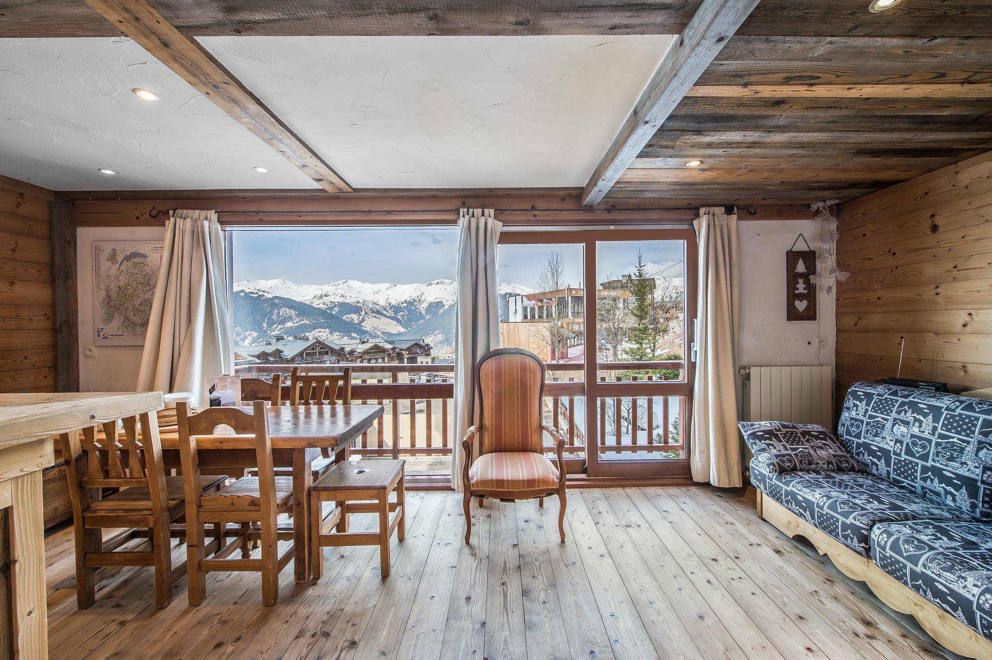 Apartment with typical mountain decoration, ski in ski out with view on the ski area, the peaks and the valley. The apartment is located in the center of Courchevel Moriond, close to all amenities.