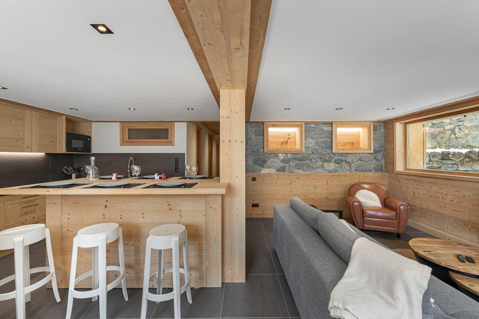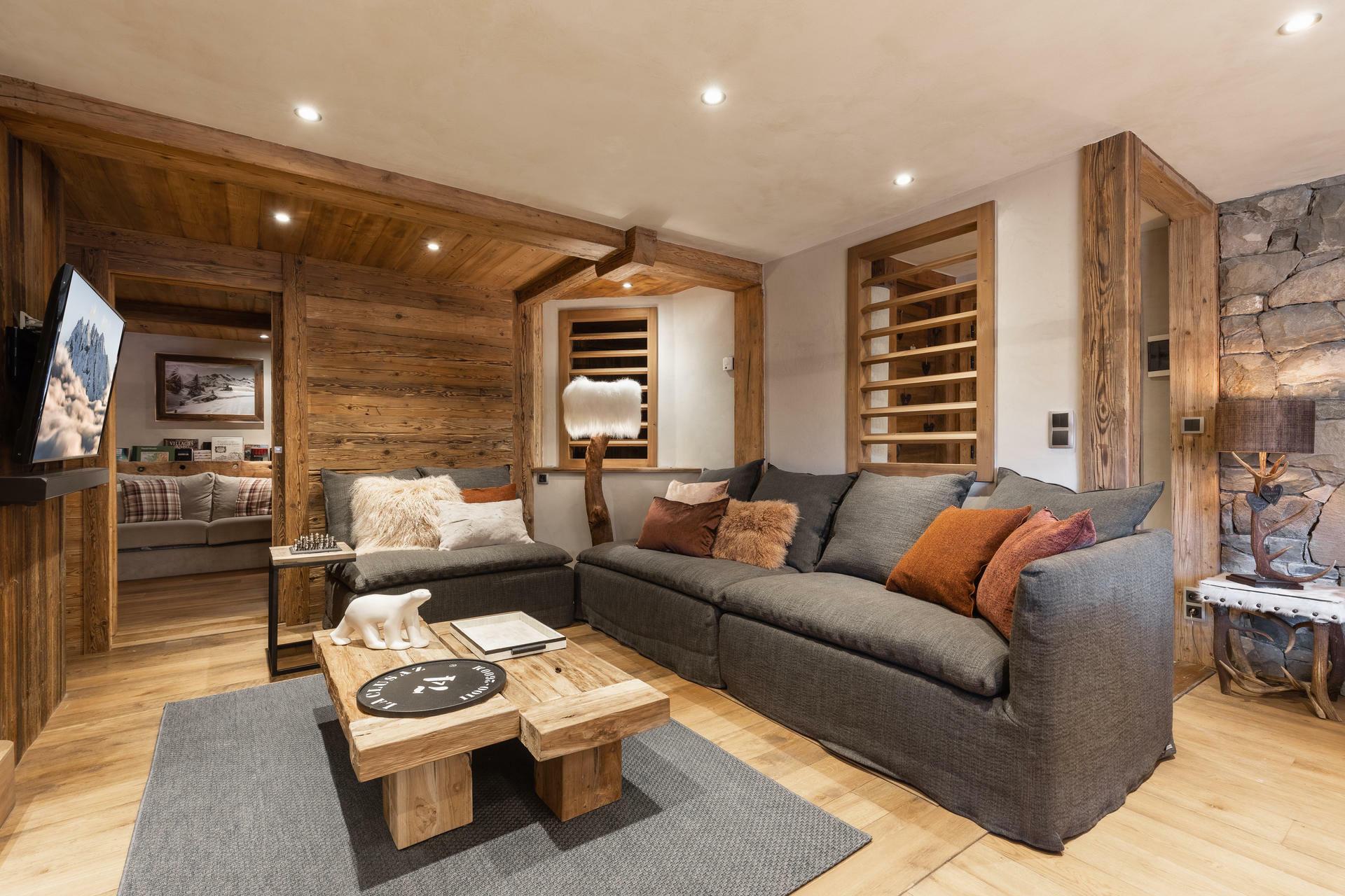 Chalet located in a quiet area of the Confins valley, blending traditional architecture and refined decoration. Bathed in light, the living room is a real place of conviviality.