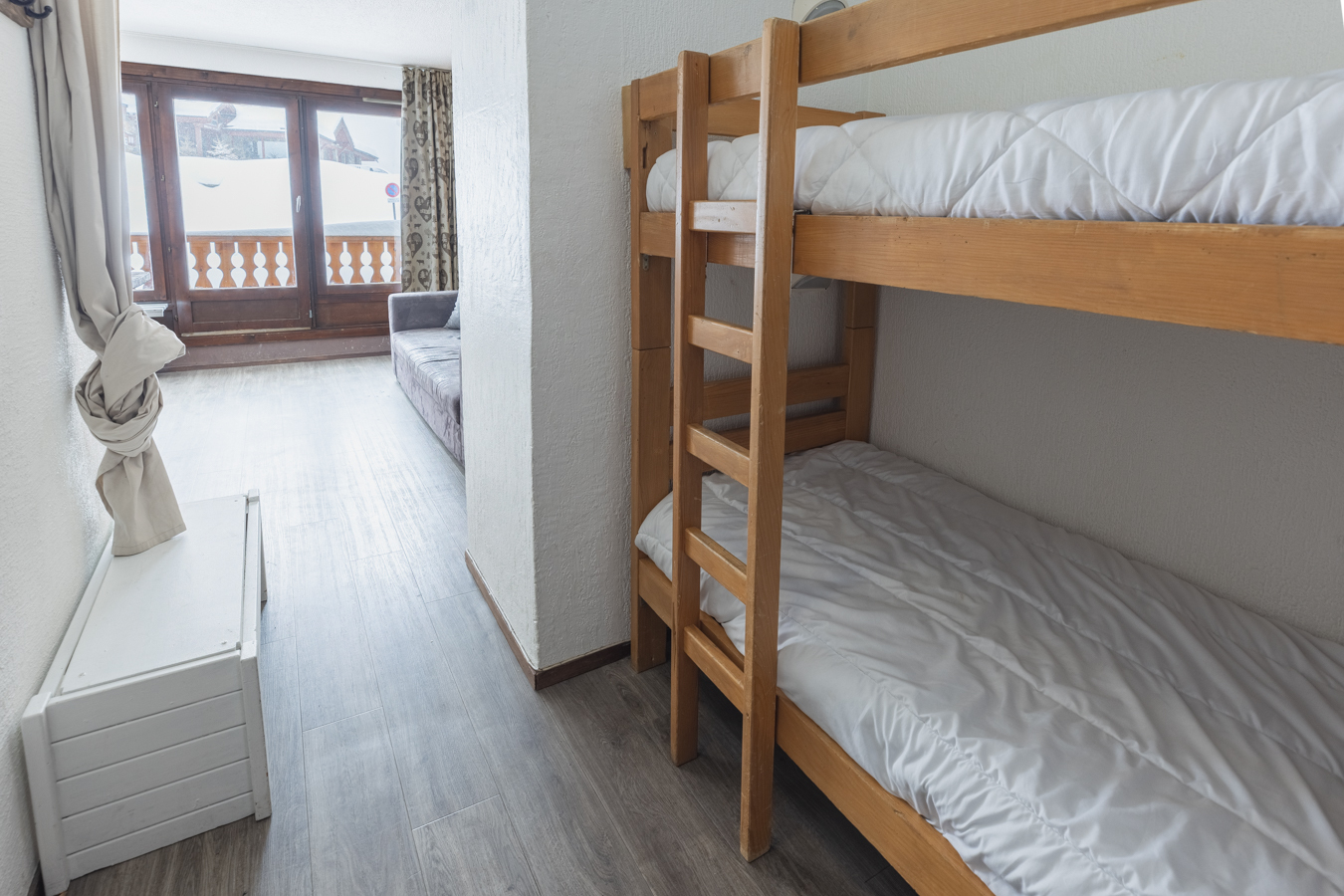 Il se compose d’une kitchenette ouverte sur la pièce de vie, d’un coin montagne, d’une salle de bain avec WC et d’un balcon.