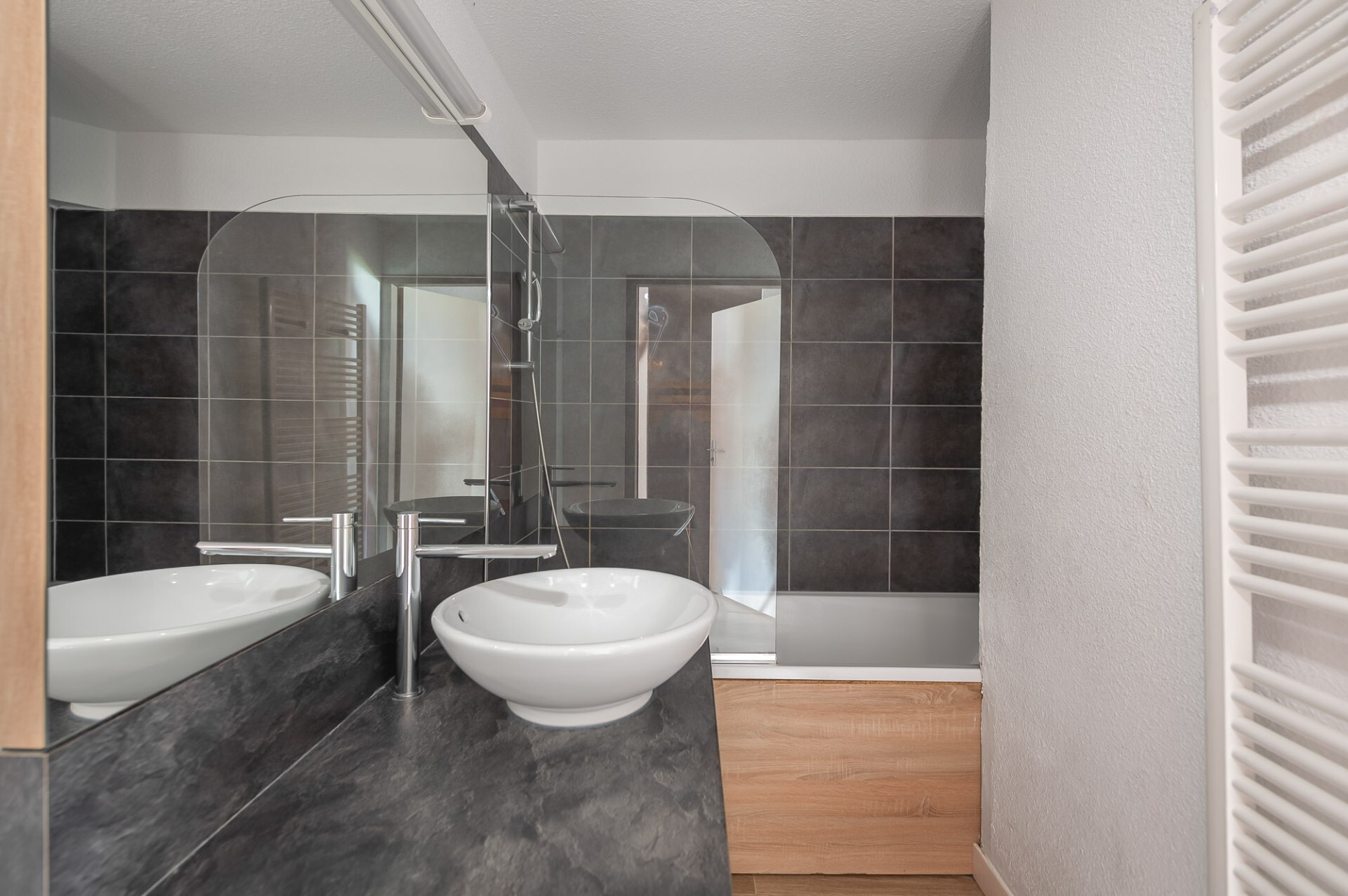 Une salle de bains moderne et un WC séparé s’ajoutent au confort de ce bien.
