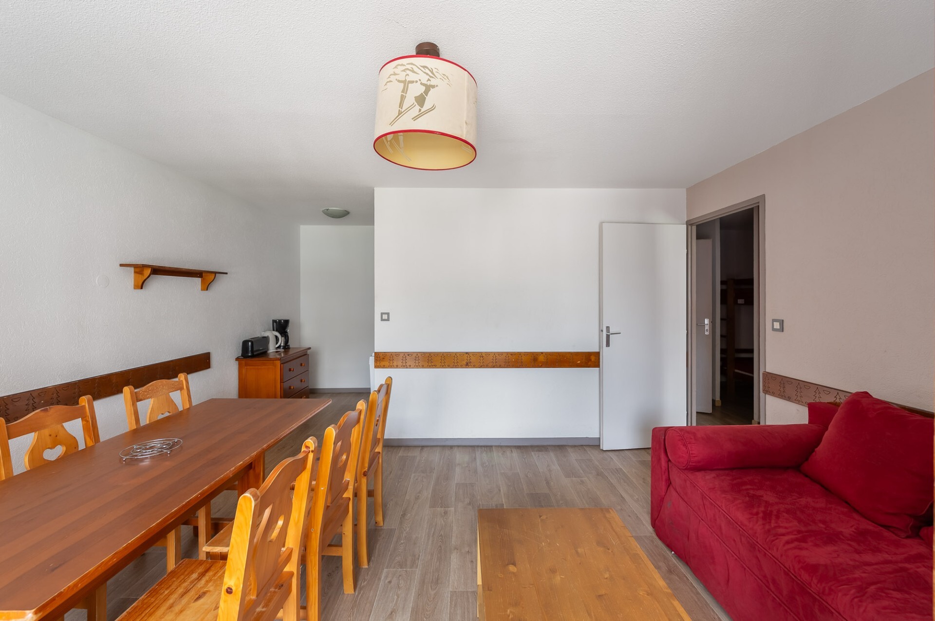 L’entrée dispose de rangements ainsi qu’un coin montagne. Le séjour lumineux et chaleureux est accompagné d’une cuisine équipée.