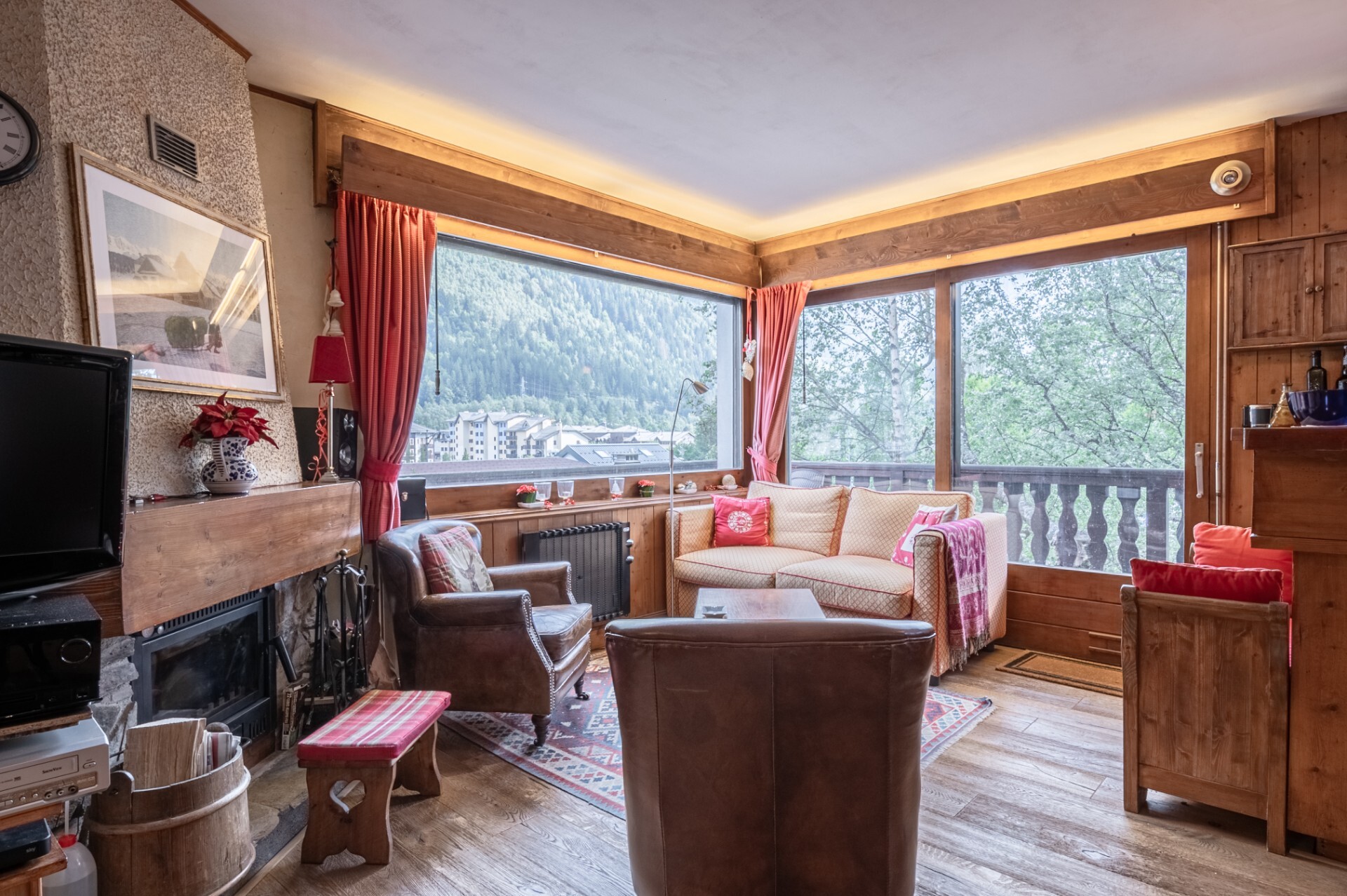 Le deuxième appartement dispose d’une entrée avec dégagement, un WC indépendant, une chambre double avec balcon, une salle de bain, une cuisine équipée ouverte sur un salon avec cheminée donnant accès à un grand balcon d’angle face au Mont-Blanc.