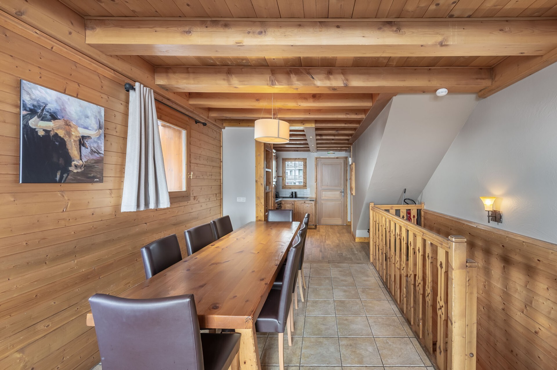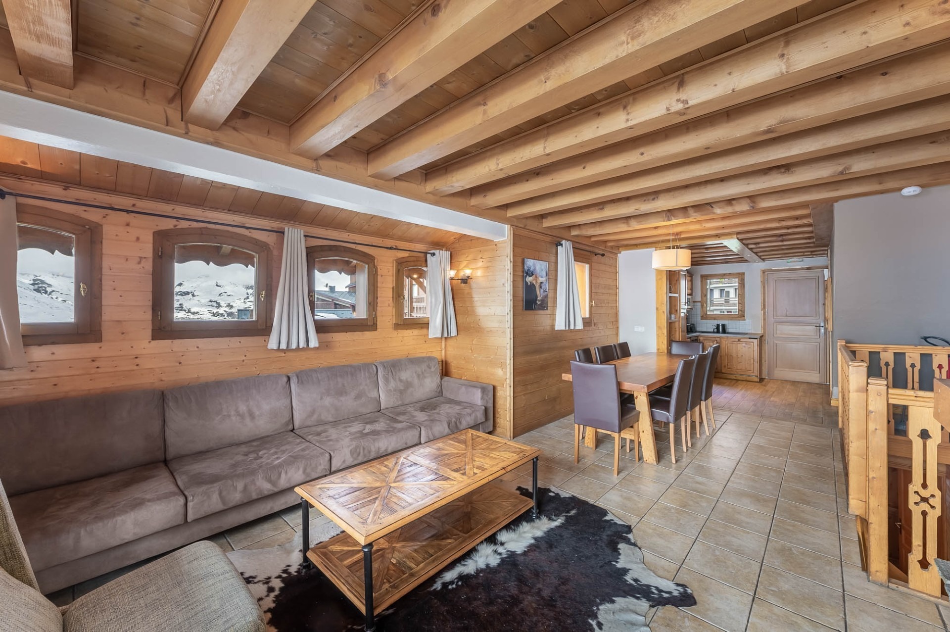 Au niveau 2 : un séjour lumineux traversant avec une cuisine ouverte entièrement équipée. Le balcon accessible depuis ce niveau offre une vue panoramique sur les montagnes environnantes.