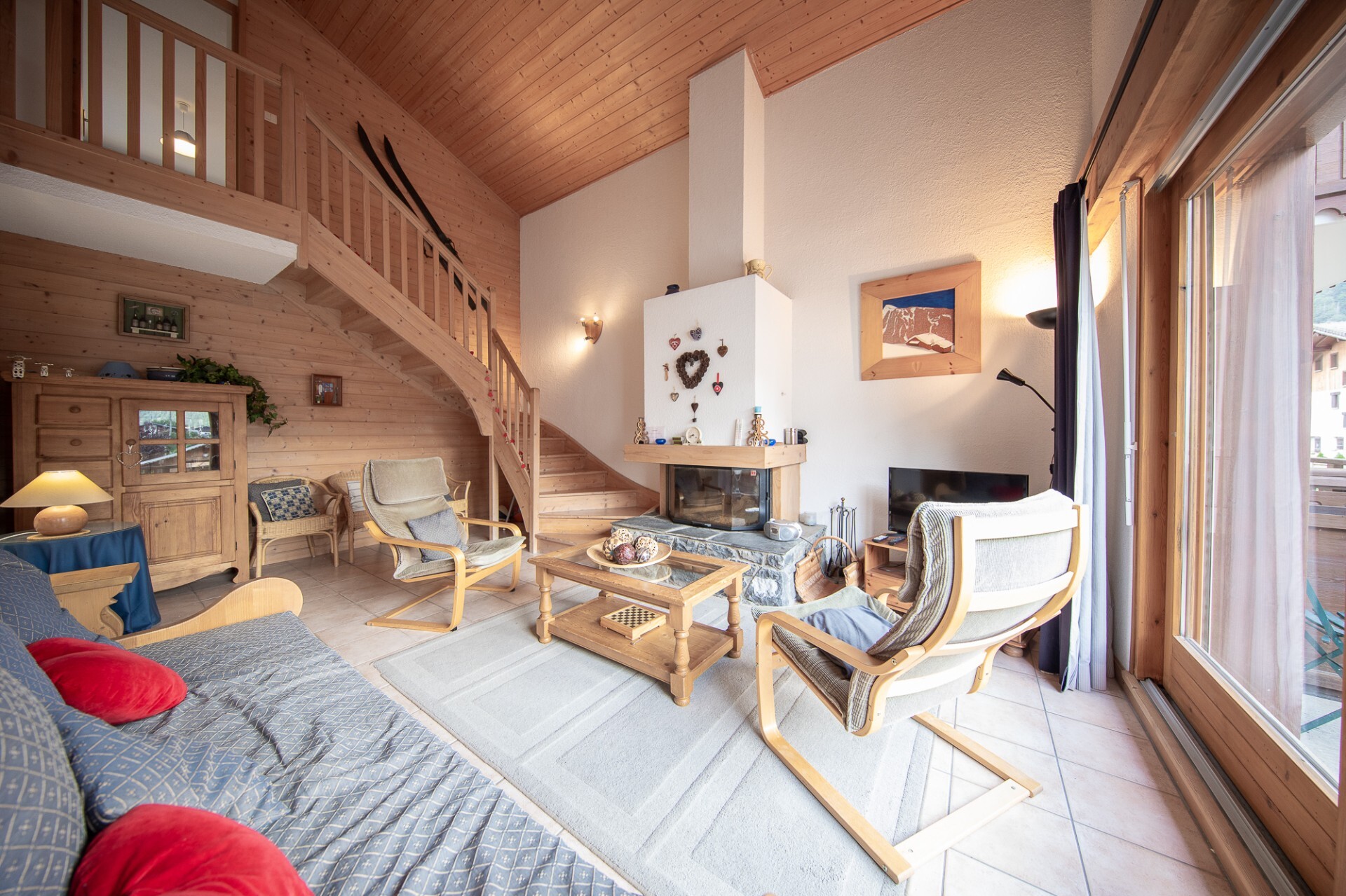 A bright south facing living room is fronted by a deep balcony big enough for a table and chairs with views towards the town and the mountains. This double height room has a kitchen and area and a lounge area with a fireplace then stairs leading to the upper level.