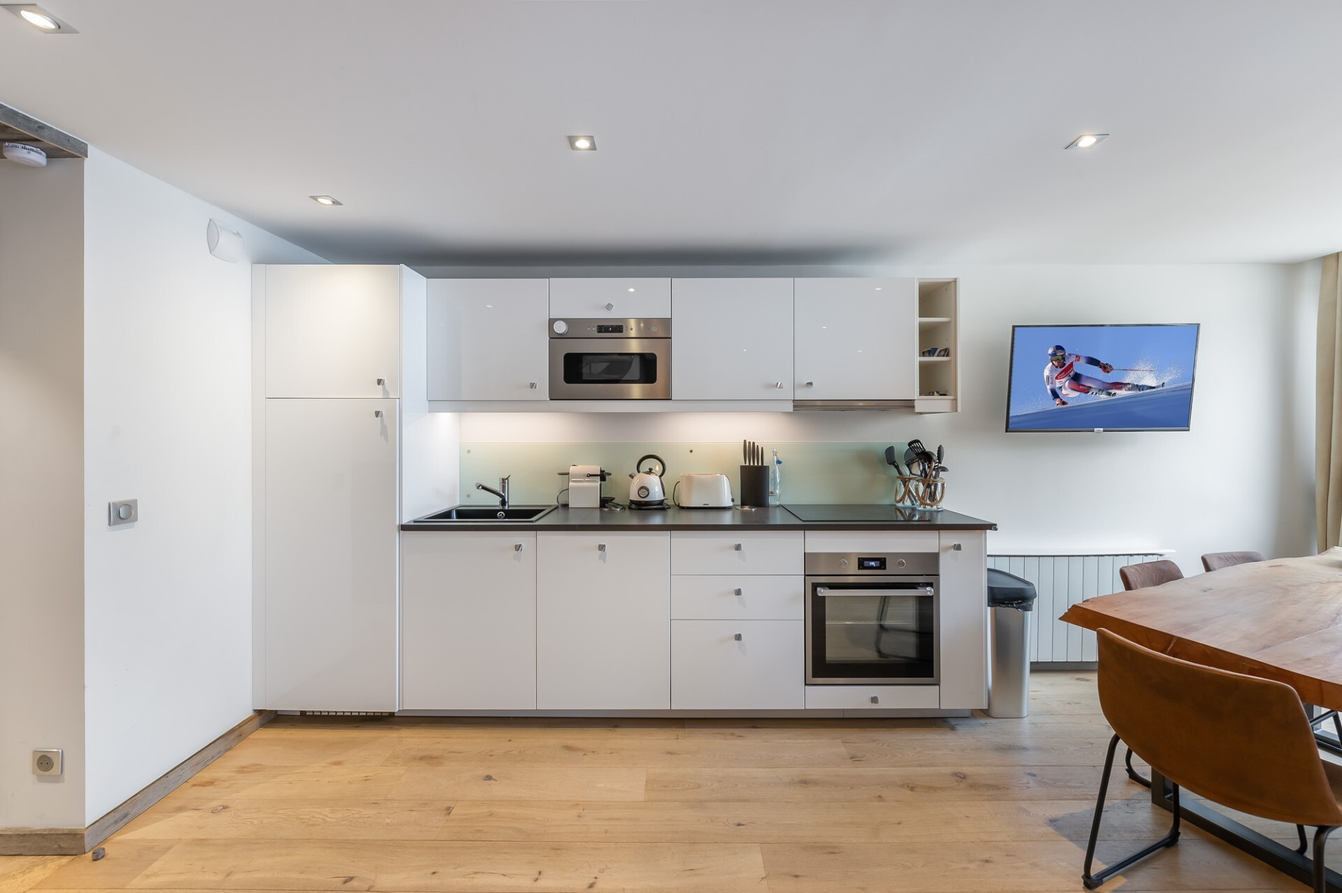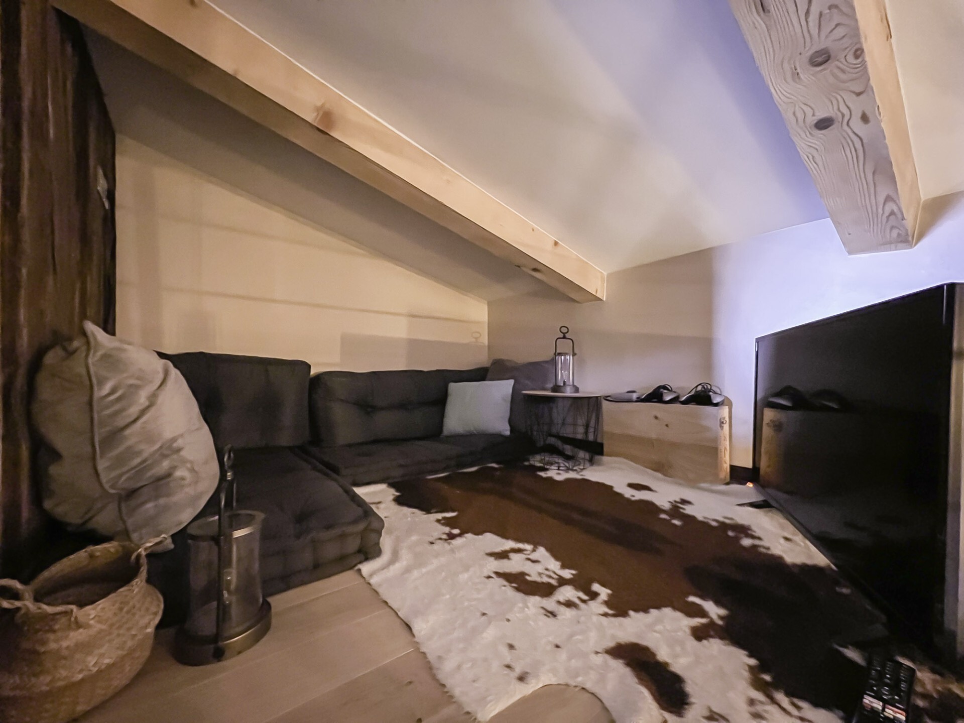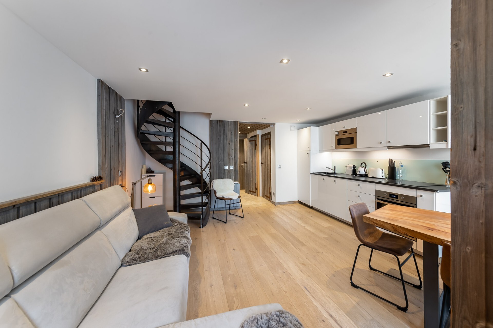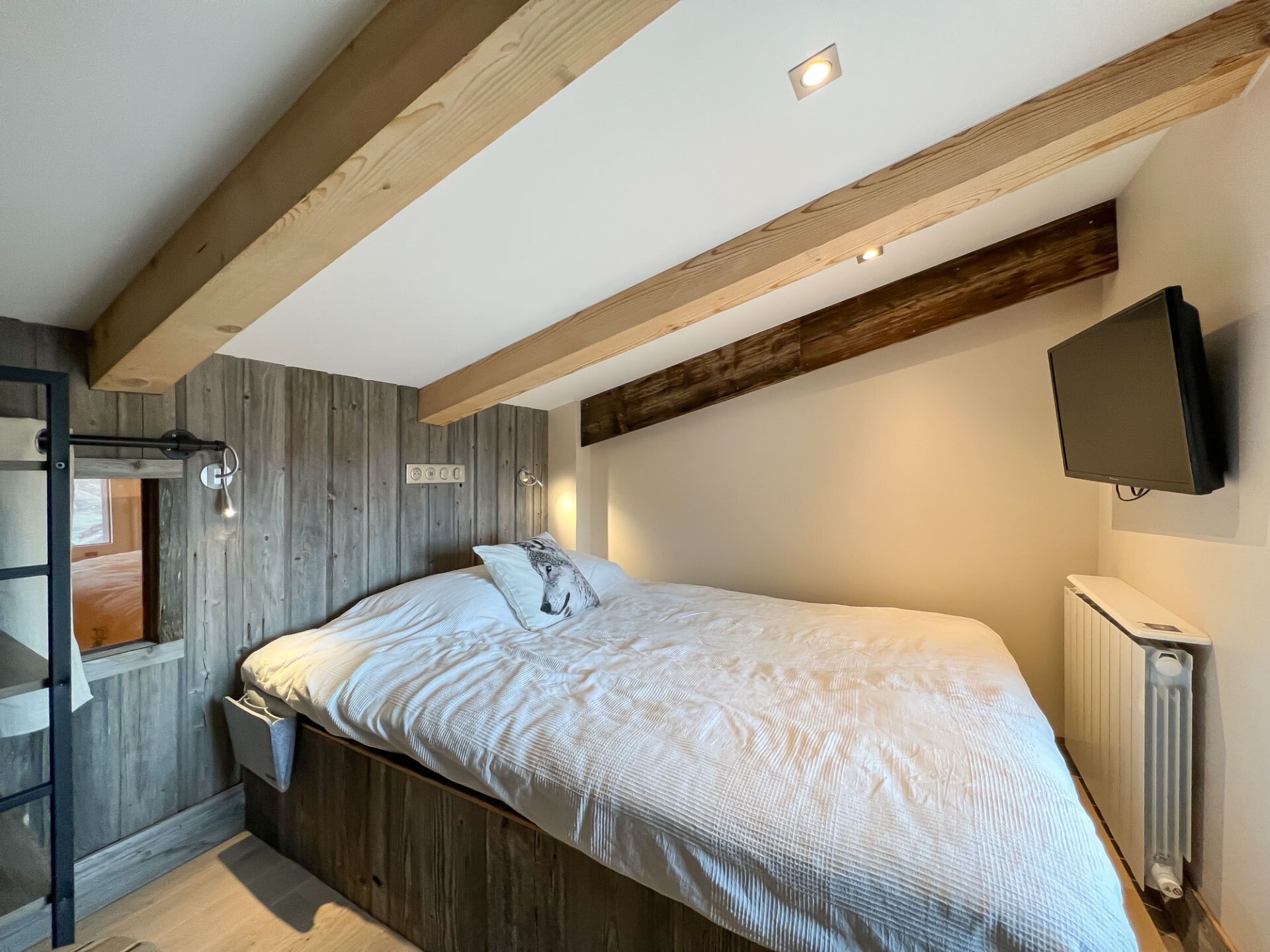 With a living space of 67 sqm, it is composed as follows: on level 0; an entrance, a storeroom equipped with a washing machine, a dryer and a shoe dryer, an independent WC, a modern equipped kitchen open on the dining room and the living room. On the second floor; a double bedroom en suite, a shower room and an independent WC. On the second floor; two double bedrooms and on the intermediate level a cocooning space with television.
