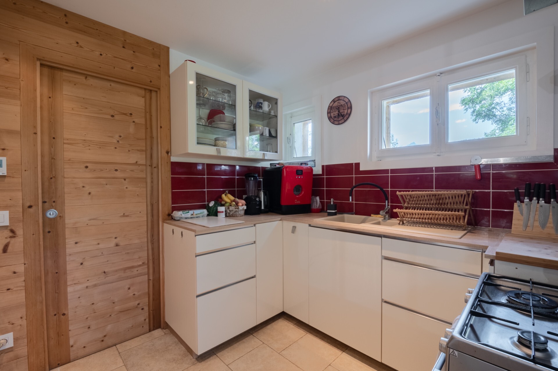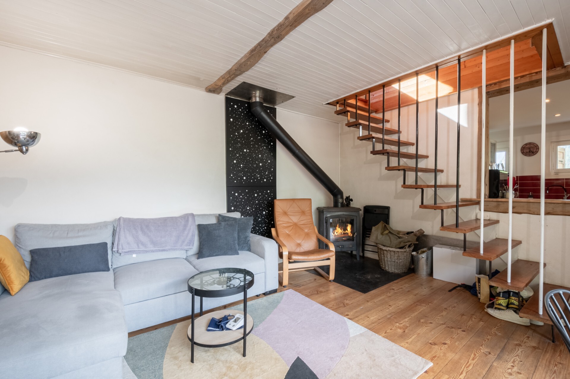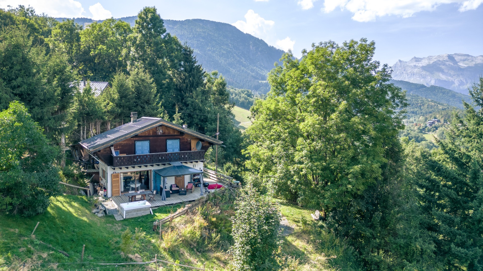 The main chalet comprises a large living room with wood-burning stove opening onto the terrace, an open-plan fitted kitchen, a shower room with WC.