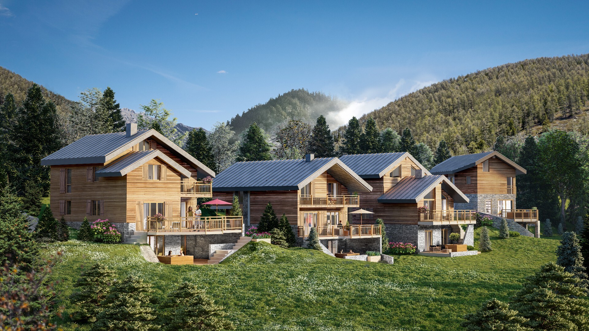 You’ll enjoy a beautiful private outdoor space with terrace and lawn. Access to the exterior is via the garden level or the first floor of the chalets.