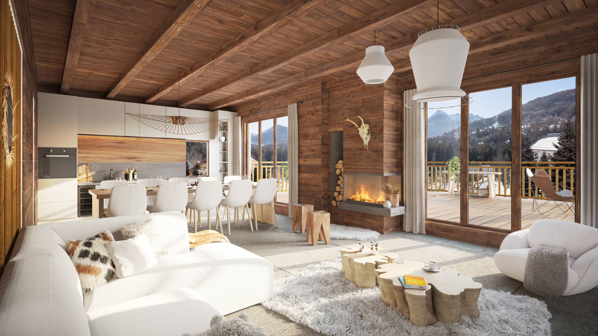 Each chalet is built on three levels and features spacious living areas bathed in light thanks to large bay windows.