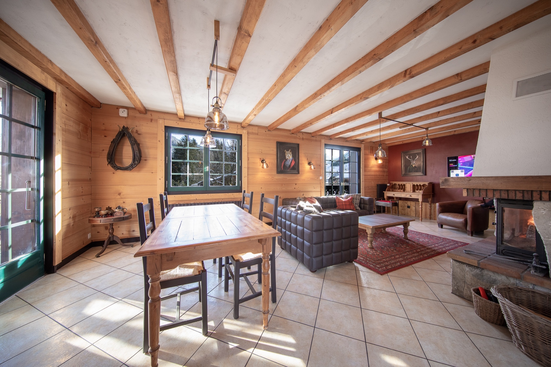 The living room forms an L shape with the kitchen and dining area, with French doors and a fireplace that works very well to heat the room alongside centrally fed radiators.
